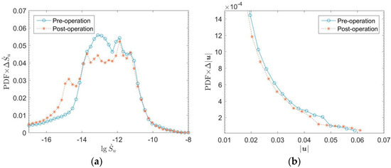 The energy generation rate can value the energy loss of flow. Higher energy loss leads to a higher heart load. The large bend of SVC (Superior Vena Cava) and three branches above AA have high flow entropy generation. Besides, the entropy generation at the tricuspid and mitral valves of the heart is also high. The abnormal high point of entropy production at ASD is eliminated after the operation. Figure 8 shows that the cure of ASD eliminates the entropy generation in the interval above 10−11. Figure 9 shows the results of probability density function f(x) × dx of entropy generation and flow velocity before and after operation for comparison. The entropy generation in the heart is mainly between 10−15 and 10−10. Meanwhile, Figure 9a shows that the entropy generation varying from 10−14 to 10−12 is also eliminated after the operation. It is believed that the operation can eliminate both high and medium entropy generation rates.