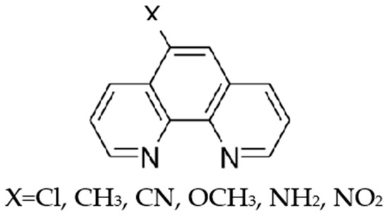 The synthesis of the 5-substituted nitro and amino derivatives (Figure 2c,d) was made according to a procedure reported in reference [20]. Water content in 5-Cl- and 5-CH3-1,10-phenanthrolines was checked using Karl Fischer titration (Mettler Toledo C20 Coulometric KF Titrator).