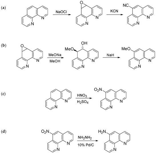 In particular, 5-Cl- and 5-CH3-1,10-phenanthrolines were purchased (Sigma-Aldrich, purity > 98%) and used as received. The 1,10-Phenanthroline-5,6-epoxide, precursor for the synthesis of 5-CH3O-1,10-phenanthroline and 5-CN-1,10-phenanthroline, was prepared from reaction of 1,10-phenanthroline and sodium hypochlorite according to a literature procedure [19]. The synthesis route for 5-CN-1,10-phenanthroline, 5-CH3O-1,10-phenanthroline, 5-NO2-1,10-phenanthroline and 5-NH2-1,10-phenanthroline is reported in Figure 2, while all details for their preparation are shown in the Supplementary Information.