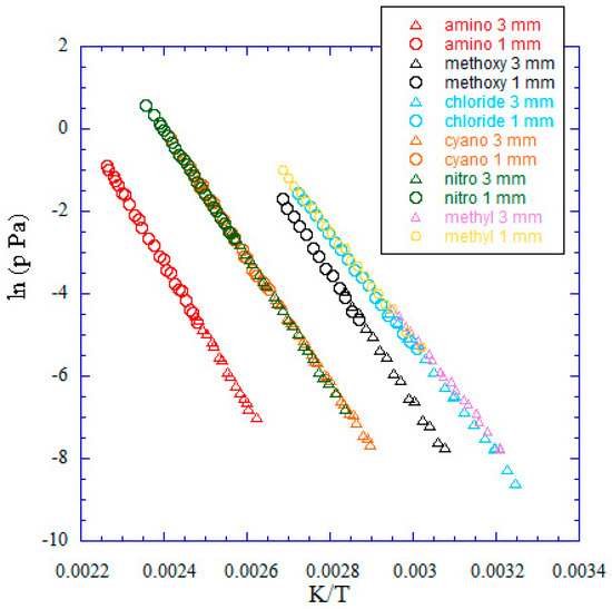 It is well known that, while measuring vapor pressures is the most direct procedure to derive sublimation enthalpies, a reliable determination of this thermodynamic parameter at a reference temperature Tref can be completed. To this end, some experiments were performed using two or more different techniques in suitable temperature ranges above the same phase or on two different phases (i.e., above the solid and the liquid), as undertaken by our group in the recent past [17,18], as well as by using some additivity properties referred to as Tref (without the need to consider any contribution due to its adjustment to Tref), especially when no literature data are available (as in this case, according to our knowledge).