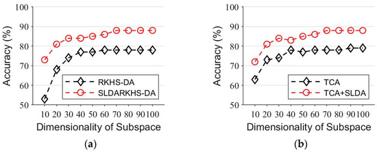 The computational complexity of the SLDARKHS-DA Algorithm 1 consists of the following three main components: (1) the complexity of the feature problem optimization in step 2, (2) computing and and (3) the computing of and . The complexity is usually expressed in terms of O, and the complexity of the generalized eigen-decomposition is O(dn2) (d is the dimension of the subspace). By computing , is O(dn2), and by computing , is O(n2). Therefore, the total complexity of the algorithm is O((4d + 1)n2).