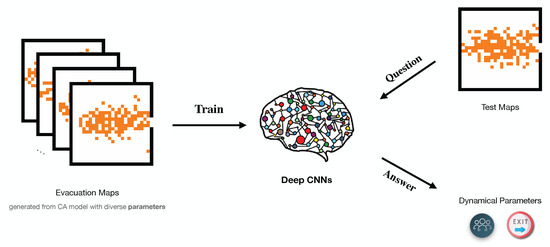 For the past few years, the development of sensor technology and the improvement of microchip computing power have been yielding unusually brilliant results in diverse fields. It makes things feasible that is collecting abundant data and using state-of-the-art machine learning methods to process them in evacuation behaviours [25,39,40,41,42,43]. Deep learning (DL), a branch of artificial intelligence (AI), efficiently integrates statistical and inference algorithms and thus offers opportunities to uncover hidden structures of evolution in complex data and to describe it with finite dynamical parameters. Therefore, a combination of DL algorithms and spatio-temporal models for evacuation based on bounded rationality is a promising option. The existing researches mainly focus on applications of DL in designing evacuation strategies based on data [44,45,46]. The other potential application is to train deep neural networks(DNNs) on simulated data sets and transfer them into real data sets to evaluate realistic situations or recognize the hidden signals, which has been verified in both physics and epidemiology [47,48,49]. Based on the methodology, as Figure 1 shows, we first introduce DL into the evacuation model to measure the optimality of decisions in such extreme scenes.