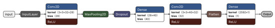 The CNN model we used to learn rational parameters from evolution. The fist module is the input layer which transfers 2-dimensional images into the following convolutional modules termed as Conv2D layers. A Conv2D layer includes kernels and the ReLU activation function. The MaxPooling operation is only implemented after the first Conv2D layer and the Dropout is adopted to avoid the possible over-fitting. Between the final output layer and Conv2D layer, there is a Flatten operation to convert 2-dimensional intermediate data into a list which can be transferred by a fully-connected layer for output values. The fully-connected layer is named as Dense.