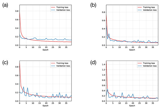 The training histories of the CNN models with 1, 2, 3 and 4 convolution layers correspond to (a–d). The blue lines are the loss on the validation data-set and the red line shows the corresponding loss on the training data-set.