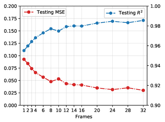 In Figure 5, we demonstrate the testing performance of the CNN model on different numbers of consecutive frames. The MSE and are chosen to evaluate the results learnt from different consecutive evolutions, where is the sum of squares of residuals between predictions and ground truths and is the total sum of squares in testing data-set which is proportional to the variance of the data. By increasing the number of the frame from 1 to 32, the prediction of rational parameter tends to reach the ground truth . As a relatively ideal result, eight consecutive frames achieve a testing loss of 0.062 and R-squared value 0.9771. It should be mentioned that while increasing the frame number does increase overall accuracy by a marginal degree, the amount of data (here is time, in real-life applications) required to analyze in these models grows disproportionately against model accuracies. Selecting frame numbers as low as possible is more realistic for generalizing our framework to assist real-life applications to react more quickly.