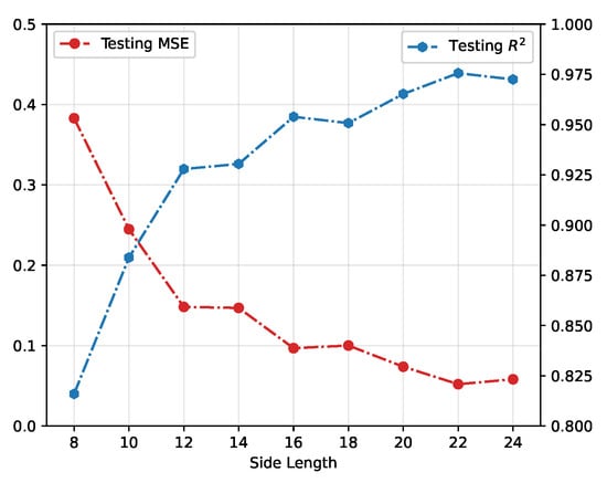 Now, we are concerned about a more realistic scenario, in which evacuation information is partially missing. In reality, the observations of collective behaviour are routinely noisy and(or) incomplete. How to process and understand the hidden behaviour patterns is one of the urgent topics in, e.g., stewardship [53] and social networks [54]. The CNN is trained on parts of the images we prepared before. This means that the side length and position of the prepared images are set to be different instead of the number of the frame. In concise, we select a square area with a given side length off from the 24 by 24 images we generated and determine the position of the image part by defining the coordinates of the upper left corner on the original image. Using the same 10,000 images and 2-layer CNN, the input images are set with side lengths from 8 to 24 (Images of side lengths less than 8 contain too little information to train a 2-layer CNN model). In Figure 6, results show that the longer the side length, the more accurate the prediction is, which is consistent with the information completeness. With regard to the position of cut images, the top left corner and right centre (where the exit is) are tested. The inspection using different side lengths as a sample shows the obvious advantage of providing information at the outlet. In addition, when monitoring the exit, a 12 by 12 image section can achieve an accurate prediction of the entire situation with MSE = 0.094 and , which is close to the performance of training on complete images.