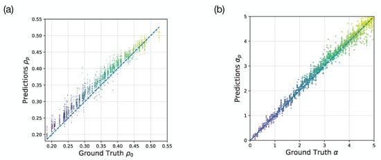Robustness examinations. (a) The predicted initial population densities and their corresponding ground truths at the same dynamical factor ; (b) The predicted dynamical factors and their corresponding ground truths in the double-exit case at the same initial population density . The colors of dots label the value of ground truths.