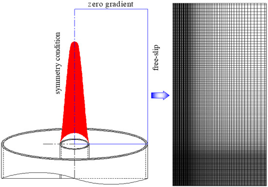 The burner, flame, and computational domain as well as the grid are shown in Figure 1. Since the coflow laminar diffusion flame is axisymmetric, it can be reduced to a two-dimensional model that contains the axial and radial. As shown in Figure 1, the computational domain is 67 mm (height) × 22 mm (radius) and divided into 164 × 72 control volumes. The grid is non-uniform, and very fine grids (0.24 mm × 0.2 mm) are placed in the main combustion area. The conditions of free-slip and zero-gradient are enforced at the boundary of the coflow stream and exit boundary, respectively. The tip of the burner is considered to be at a constant temperature of 300 K. The computation results that are independent of the grid have been verified in [20].