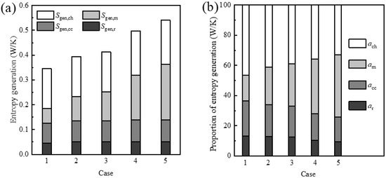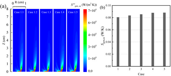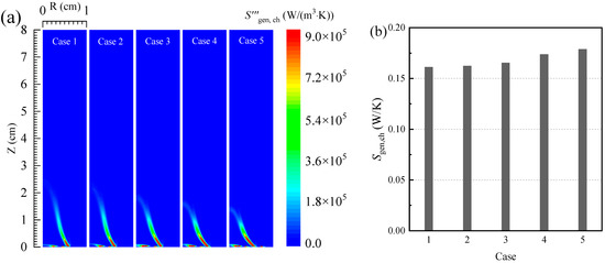 Figure 3 shows the distributions of the local entropy generation rate as well as the total entropy generation due to heat conduction and convection in the five cases. As shown in Figure 3a, the local entropy generation rate due to heat conduction and convection is mainly concentrated in the region inside and outside the flame surface. Meanwhile, since the temperature gradient of the medium at the tip of the burner is high, the heat conduction and convection process are more intense, and the thermodynamics irreversibilities enhances and local entropy generation rates increase in the region. However, although the temperature of the medium near the flame surface is high, the heat conduction and convection process is weak due to the low temperature gradient of the medium, and the local entropy generation rate due to conduction and convection is low in the region.