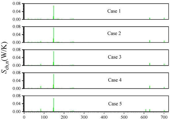 Figure 6 shows the chemical entropy generation by each chemical reaction (). It can be seen that the reaction R148 has a significant impact on the thermodynamics irreversibilities of the chemical reaction, and the chemical entropy generation due to the reaction exceeds 50% of the total chemical entropy generation. Additionally, there are five other reactions that also have a high impact on chemical entropy generation, and the detailed chemical formula is shown in Formula (6).