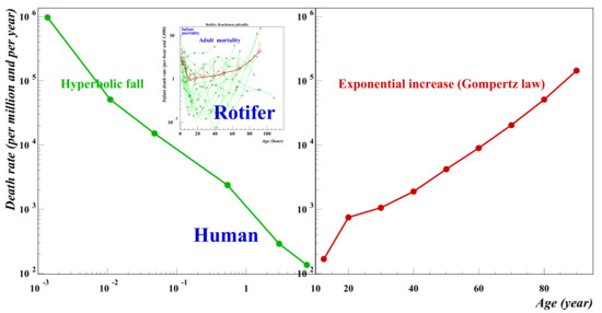 In a series of recent papers [1,2,3] the present authors have studied human mortality demonstrating how the shape of the mortality function has a bathtub type of shape where the infant mortality decreases with age whereas in old age it increases (Figure 1). In medical terminology infancy refers to new born under one year of age. However, in reality the decrease of the death rate continues until the age of 10, For humans, the increase of the death rate is described by the well-known law of Gompertz [4]. This law can be summarized for by saying that the death rate doubles approximately every 10 years of age. Even the mortality of small animals such as rotifers [3] exhibit similar behaviour as is shown within the inset in Figure 1.