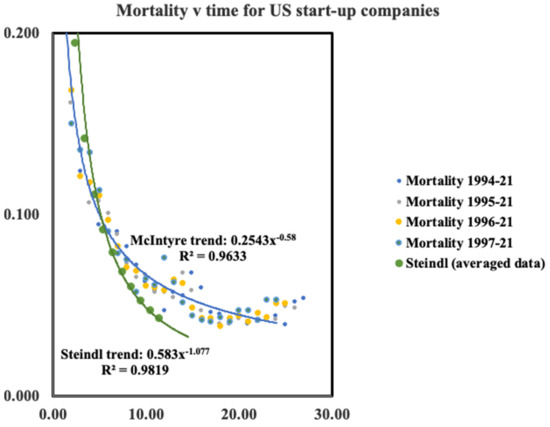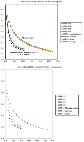 Much has been written about the survival of start-up companies. Usually this is directed to reasons why such companies fail and do not manage to survive the so-called valley of death in which companies fail due to inadequate working capital. Many other reasons can lead to failure, poor management, marketing, etc. Here, we are not concerned with these micro details rather we shall explore the mortality from a physics perspective looking for general features which characterize the mortality of all companies. For our purposes, a useful dataset is provided at LinkedIn in a paper by McIntyre [6]. Here, can be found survival data for cohorts of companies from their start-up year of 1994 through to 2021. More data is provided for similar cohorts beginning in 1995 and all years through to 2020. Each dataset consisted of over 500,000 companies ensuring good statistics. Earlier data for the period 1947–1954 is given by Steidl [7]. Steidl differentiates between manufacturing, retail and service industries. We show in Figure 2, survival probabilities for both data sets. The broad trend is similar but clearly the data for 1947–1954 falls more steeply than that for more recent years.