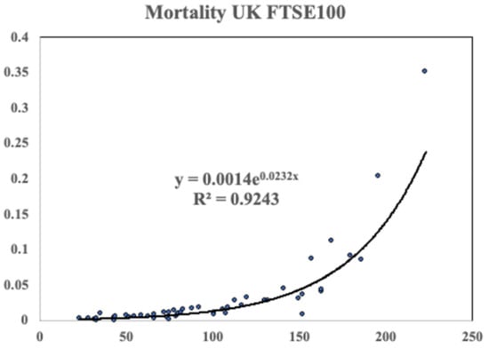 The mortality of the FTSE100 data on a linear plot. The data was computed using the method outlined in the text. The solid line is an exponential fit corresponding to Gompertz like behaviour.
