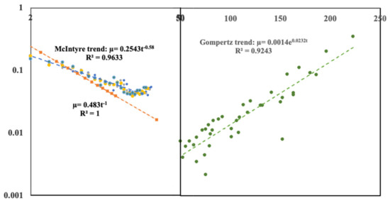 The Steindl data is fitted extremely well by a hyperbolic function as can be seen on Figure 3. For the average values we find . This allows us to compute the mortality directly by simple differentiation. Thus However, from the figure it is readily seen that neither an exponential nor a hyperbolic function fits the McIntyre data and a simple first order difference procedure was used to compute annual values for the mortality which does however follow a hyperbolic function over much of the timescale. Thus, both McIntyre and Steindl data sets decay in a similar way following closely the hyperbolic trend . Decaying with a power law of −1, the Steindl data follow the value observed for human mortality. The more recent data decays more slowly.