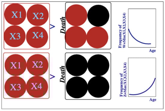 Again using the same ideas, early stage death would mean that the age of death is: W = 0.1, the is W = Min(X1, X2, X3, X4). Again we refer the reader to [1] where it is shown that for p elements in terms of the density f(x) and cumulative distributions F(x) for the single elements the density function for early death is