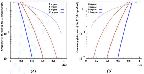 For the simple case of a random variable with a uniform density over the interval (0, 1); in this case: for x ∈ (0,1): f(x) = 1, F(x) = x. Thus for x ∈ (0,1): fZ(x) = pxp − 1. This function, shown in Figure 8b for p = 2, 4, 8, 15, is a power law function that increases fast with age. This is consistent with a Weibull distribution but when p becomes large it has the shape of an exponential which is qualitatively consistent with Gompertz’s law according to which the probability of death increases exponentially with age.