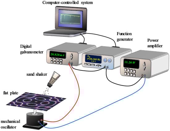 Figure 1 depicts the experimental scheme for the modern Chladni plate driven with an electronically controlled mechanical oscillator [16]. A sinusoidal function generator with an automatic scanning system was designed to measure the spectrum of resonant frequencies with a resolution of 0.1 Hz. Two different plates were used to investigate the resonant Chladni figures. One is a square plate with a side length of 320 mm; the other is an equilateral triangle plate with a side length of 365 mm. Two thin plates were manufactured with aluminum sheets with a thickness of 1 mm. The center of the thin plate was fixed at the mechanical oscillator with a screw supporter. The mechanical oscillator was excited with an amplified sinusoidal voltage source for the frequency ranging from 200 to 5000 Hz. A digital galvanometer was connected in series to the mechanical oscillator to measure the electric current through the vibrating system. Since the resonance causes the electric resistance of the vibrating system to increase abruptly, the resonant frequencies can be precisely determined via probing the change in the electric resistance of the system [16]. We employed silica sand of 0.3 mm grain size to exhibit Chladni figures at resonant frequencies and exploited a digital camera to store the experimental images.