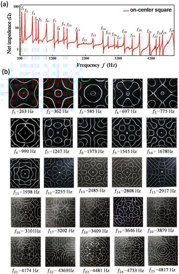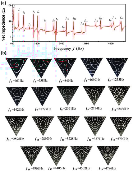 Figure 2a shows the measured spectrum for the variation of the resistances as a function of the driving frequency in the vibrating square plate. The resonant frequencies can be precisely identified from the peaks of the frequency spectrum. The nodal-line patterns of the resonant modes are shown completely in Figure 2b. All nodal-line patterns can be found to be obviously distinct from the chessboard structures of eigenmodes. Experimental results for the frequency spectrum and individual resonant nodal-line patterns obtained with the equilateral triangle plate are shown completely in Figure 3a,b. Like the results for the square plates, resonant nodal-line patterns are dissimilar to the nodal-line structures of eigenmodes.