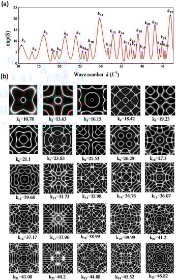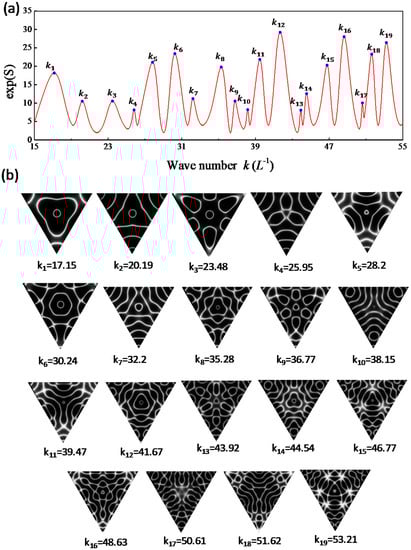 Based on thorough computation, the entropy is confirmed to be nearly independent of the choice of the upper index N on condition that is satisfied. Since the range of kL for investigation is less than 60, the results obtained with are used for convenience. Figure 4a depicts the calculated results for as a function of k with . The nodal-line patterns corresponding to the local maxima are shown completely in Figure 4b. The nodal-line patterns can be one-to-one seen to agreeably resemble the experimental results for the resonant modes shown in Figure 2b. Not only the square plate, the same correspondence between the resonant frequencies and the maximum entropy states can be also confirmed for the equilateral triangle plate, as shown in Figure 5a,b for calculated results with .