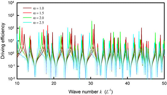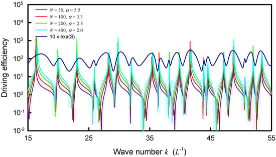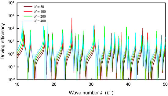 Unlike the numerical analyses for information entropy, the calculated results for the distribution are found to be not only dependent on the coupling factor but also on the upper index N. Nevertheless, the asymptotic behavior for the index N can be attained from the computation. The dependence of the distribution on the coupling factor is first discussed. Figure 6 shows the calculated result for by using Equation (22) as a function of k for the square plate with and N = 50 for several different coupling factors = 1.0, 1.5, 2.0 and 2.5. The coupling factor can be clearly seen to cause the redshifts of the resonant wave numbers. The larger the coupling factor, the greater the redshift. On the other hand, the dependence of the distribution on the upper index N is shown in Figure 7 for the square plate with a fixed . The overall distribution can be found to be a little redshifted with increasing the upper index N.