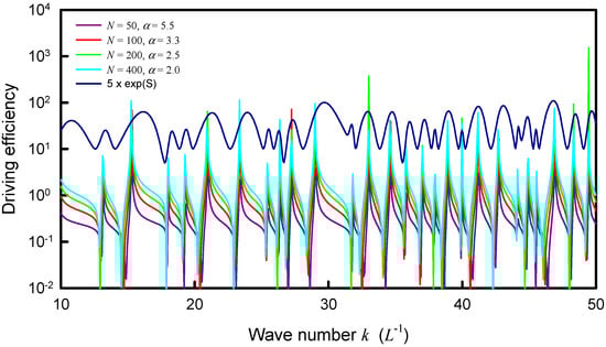 The resonant wave numbers are confirmed to approach some asymptote for increasing the upper index N. Numerical analyses reveal that as , the coupling factor of can make the distribution agree the best with the experimental spectrum as well as the maximum entropy states. In practice, when a smaller upper index N is used in the calculation, a larger value for the coupling factor can be effectively utilized to lead the distribution to be nearly the same, as shown in Figure 8. The resonant peaks of the distributions for different upper index N can be seen to excellently coincide together. More importantly, all resonant peaks agree very well with the maximum entropy states. In Figure 8, the information entropy is multiplied by a factor of 5 for convenience of displaying the comparison. Figure 9 shows the numerical result for the relationship between the upper index N and the effective coupling factor for the distributions with the best fit to the maximum entropy states. By using the deduced dispersion relation in Section 3, the distribution with and is plotted in Figure 10 to compare with the experimental spectrum. For clear comparison, the experimental spectrum is multiplied by a factor of 100. The theoretical resonant spectrum generally agrees very well with the experimental result. A little discrepancy is mainly attributed to the simplified model for the dispersion relation between f and k.