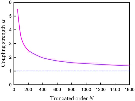 where the parameter α is a real number. The term in Equation (20) is to take account of the coupling effect between the mechanical oscillator and the thin plate. The coupling interaction comes from the reaction force of the thin plate subjected to the driving force. The dimensionless parameter α is directly related to the coupling strength. Intuitionally, the coupling strength is proportional to the relative tightness of the fixed force between the plate and the oscillator. The point interaction [38,39,40] has attracted much attention in the research of the nuclear [41], atomic [42], solid-state [43], and particle physics [44]. Furthermore, Šeba [45] studied the coupling interaction of a delta-function potential in two-dimensional integrable billiards to verify that the strong coupling can cause the transition from integrable to chaotic feature [46,47,48,49,50,51,52,53]. On the other hand, a novel method for analytically solving field distribution in two-dimensional inhomogeneous waveguides is presented in Ref. [54].