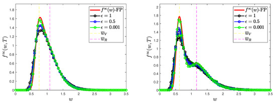 In this test, we want to observe the convergence of the numerical solution of the kinetic system (2) to the one of the Fokker–Planck system (24) in the quasi-invariant limit introduced in Section 3.1. We consider the simplified case where , and , for which we obtained the steady distributions in (25). These values are representative of realistic dynamics during the beginning of the COVID-19 pandemic; see, e.g., [6,7,8,39,54].