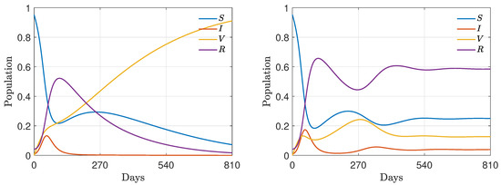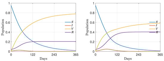 First, we consider model (2) without the modified relations (34) (or equivalently, in the absence of reinfection, i.e., ) and, as before, a fixed recovery rate and a vaccination rate with the same initial masses as those defined in (30). Furthermore, we fixed . In Figure 7, in the top row, we show the evolution for the fractions of the population in the case of (left) and (right). We may observe how a variable efficacy of the vaccine, affected by epidemic peaks, may strongly shape the immunity of the population, even in the presence of an initial high efficacy. Interestingly, in this latter case, a variable efficacy leads to the emergence of secondary peaks of infection. This is due to the presence of a smaller number of recovered persons who, unlike vaccinated people, maintain immunity.