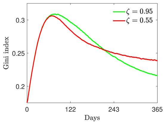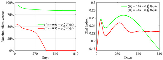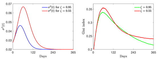 In the following, we choose and . In Figure 4 we represent the evolution of in the presence of an epidemic characterized by , . Furthermore, we compare the Gini index in the presence of two effectiveness rates of the vaccine, i.e., and . We may easily observe how an increasing variability leads to a worsening of the Gini index and, therefore, of the inequalities. The long-term behavior of the Gini index depends, as before, on the vaccine efficacy such that low efficacy leads to increasing inequalities in the long term. This is due to the fact that as we have and then .