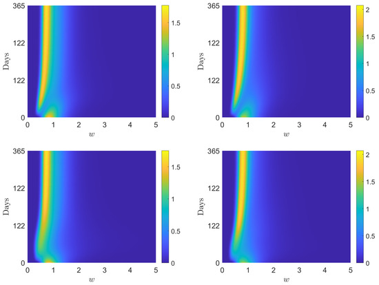 Finally, in Figure 5 we present the evolution of the full kinetic density solution to (2) in the scaling in the presence of fixed market risk or with the epidemic-dependent discussed in (31).