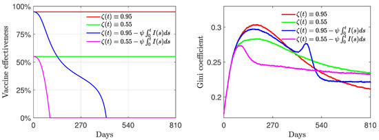 For the same choice of coefficient, in the bottom-right plot of Figure 7, we show the evolution of the Gini coefficient in the case of variable efficacy as (33). With respect to a vaccine with constant efficacy, the efficacy decay forces the emergence of sharper inequalities, which is well evidenced by the evolution of the Gini coefficient.