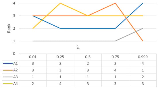 In addition to selecting the most appropriate alternative, the IF-WISP method allows analysis of the impact of membership and non-membership functions on the overall utility measures, using Equation (11). Table 5 and Figure 2 show the values of overall utility measures and ranks of alternatives for several selected values of the coefficient λ.