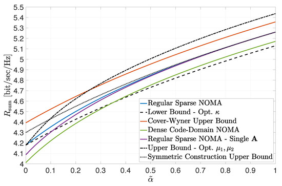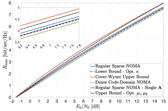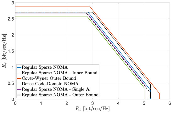 Our contribution provides valuable insights into the potential performance gains of regular sparse NOMA in several timely use cases of interest. One particular example represents a 5G-and-beyond scenario, where the two user classes respectively correspond, say, to low-complexity devices with stringent power constraints (e.g., Internet-of-Things applications) and to broadband users with higher transmit power capabilities. Another applicable use case is a single cell with users located at the extremes of either the cell center or the cell edge. Our analysis is also applicable to a compelling combination of power-domain NOMA [2,6] and code-domain NOMA, which has only recently started to attract attention in the literature [15,16,17,18,19,20,21], as discussed above. Accordingly, the corner points of the achievable region bounds correspond to a SIC scheme between the two user classes, while incorporating near-optimal joint iterative decoding (MPA) within each class. In fact, by this interpretation, our analysis provides, in a sense, an analytical benchmark for the setting considered in [20] (see also [18]), under the simplifying assumptions of non-fading channels and full symmetry among the users in each user class. Note that, in the absence of fading, the corresponding regular SCMA achievable sum rate, while assuming independent Gaussian signaling over each utilized resource, trivially coincides with the Cover–Wyner sum capacity (see, e.g., [43] and Section 3.3). Hence, our analytical bounds quantify the gap from the ultimate performance limit induced by employing regular sparse spreading signatures and may serve as reference for practical schemes that aim to approach the sum-capacity limit using the SCMA paradigm, e.g., [17,18,19,20,21]. Note that, in the presence of fading, characterizing the achievable rate region of the two-user-class system considered in this paper is still a formidable open problem yet to be explored; hence, a direct and explicit comparison with practical achievable sum rates reported in works, such as [20], cannot be performed at this stage. Yet another applicable model is a two-cell interference network, where the two user classes represent, respectively, the local cell users and the users operating in the adjacent interfering cell. This may be further extended, e.g., to Wyner-type cellular models with single-cell processing [46,47,48,49].