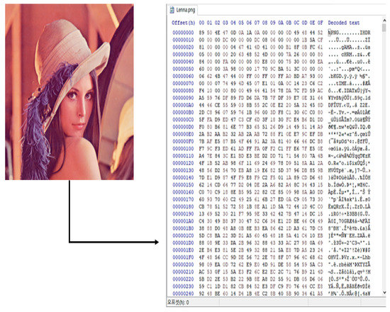 Early encoding algorithms appeared to transmit files consisting of ASCII (American Standard Code for Information Interchange) characters on the network. At this time, for the data exchange system to transfer a file composed of binary data, it was necessary to encode the data into ASCII characters, and then decoding was used to recover the received ASCII characters into binary data. Here, a binary file is a file composed of 0’s and 1’s for the purpose of file storage and information processing on a computer, and it is different from the txt or csv file format, each of which is a text file type [10]. Figure 1 shows an example of a picture file, which is one of the binary file formats.