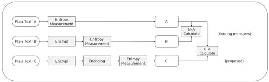 As described in Section 2.1.2, the different binary-text encoding algorithms are configured and operated according to each purpose. However, all encoding methods commonly perform the step of converting a string into another string, and in this process, the data of the file are converted from binary to text. After encoding, the encoding result of the file changes the entropy value of the file. Based on this fact, [10] applied the base64 encoding algorithm to the ciphertext to decrease the entropy of the encrypted file.