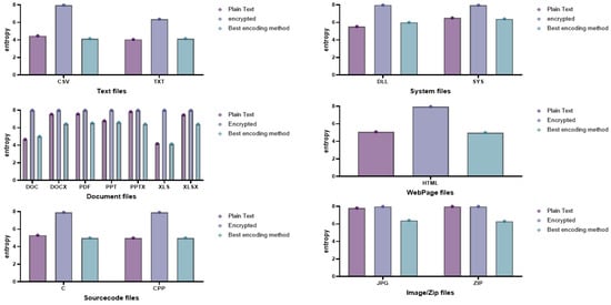 The above figure shows the best entropy measurement results for a total of 16 file formats according to a total of seven file types: text files, system files, document files, web page files, source code files, image files, and compressed files. To neutralize the ransomware detection technology by deriving an optimal encoding algorithm that has the entropy most similar to that of plaintext, we compared the average entropy of plaintext, ciphertext, and files to which the optimal encoding algorithm is applied. Specifically, both the CSV and TXT file formats as the text file type showed that the entropy of the plaintext and the entropy of the encoded file were almost similar. Further, system files, web page files, and source code files show the same results, which means that the ransomware detection technology is neutralized by applying the best encoding algorithm proposed in this paper.