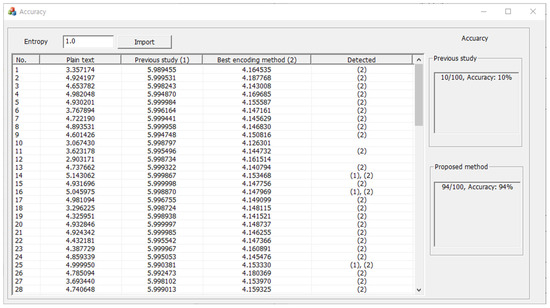 In Section 3.5, it was experimentally verified that the ransomware detection technology was more effectively neutralized by applying the optimal encoding method proposed in this paper than that used in the previous study. In this section, it is shown that, for a more objective performance comparison and analysis, the entropy threshold was set, and the neutralization accuracy of the previous study and the proposed method was derived based on the set threshold value. Based on the results shown in Table 2, the entropy threshold was set as an intermediate value between the difference between the entropy of the plaintext file and the entropy of the encoded file, and the set entropy threshold ranged from 1.0 to 2.0. Further, to derive a more accurate neutralization accuracy, the accuracy was measured while increasing the entropy threshold by 0.5. Figure 6 shows an example of a program that detects neutralization accuracy in CSV file format for comparing and analyzing neutralization accuracy.
