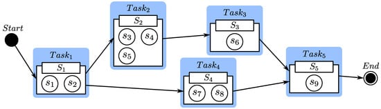 A service workflow, i.e., a composite service, includes a set of tasks []. According to service planning, there may be more than one way to build a composite service []. Figure 1 depicts a composite service that can take one of two paths: , , ,  or , , . Each task  may be performed by any elementary service in service class . The rating information of each elementary service is shown in Table 1.
