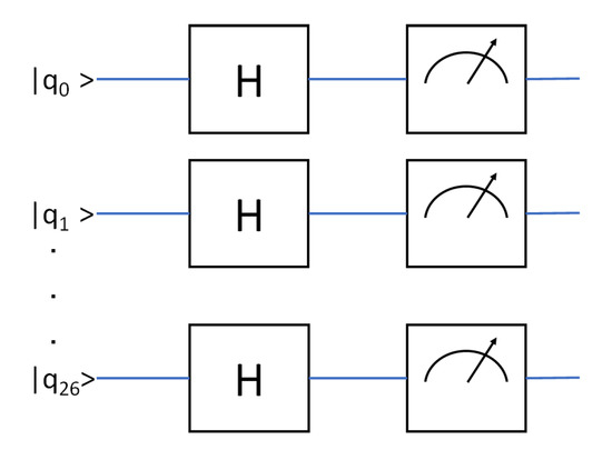 The probability (Pr) for each qubit, as defined by Equation (28), was estimated by executing the circuit in Figure 1 and counting the faction of zeros in the 8192-bit long binary string, returned by the remote server. Let denote the random measurement outcome (a classical bit) when we conduct a experiment and measure the q-th register element in the l-th experiment’s s-th shot (measurement done in the computational Z-basis). Let denote the corresponding observed value. Similarly, let denote the probability of observing 1 as the outcome in the l-th experiment for the q-th register element. Similarly, let denote the probability of observing 0 as the outcome in the l-th experiment for the q-th register element. Thus:
