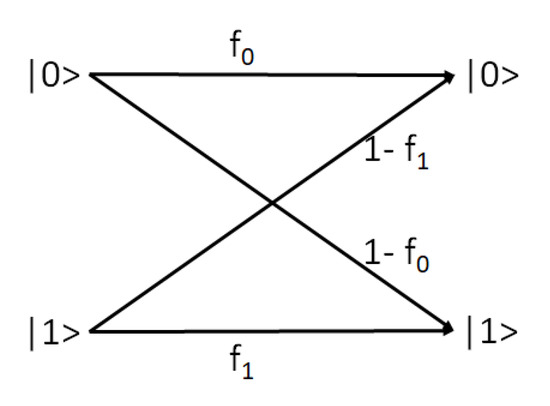 The first parameter () defines the probability of observing 0 post readout when the channel input state is , and the second () defines the probability of observing 1 post readout when the channel input state is .