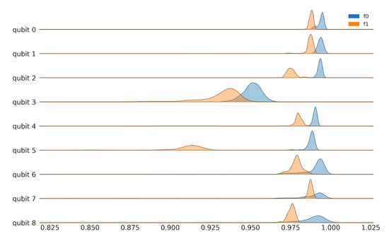 Figure 3 shows the experimental results for the fidelity distributions of and for the first nine register elements of ibmq_toronto, collected on 8 April 2021, between 8:00–10:00 p.m. (UTC-05:00). The initialization fidelities of the computational states are not the same and, for some register elements, they are very distinct. The asymmetric nature of the single qubit noise channel is brought out starkly by the negligible overlap between the distributions of and for qubit 5. Additionally, observe the significant spread in values (indicating channel instability) in qubit 3, relative to the others. These results show that the naive approach of assuming a single value for readout error for a qubit is dangerous. Not only do we have to characterize and separately, our work must also take into account the significant dispersion around the mean. The remaining register elements are shown in the Appendix B in Figure A2 and Figure A3. The register variation of the readout asymmetry is shown in Figure A5.