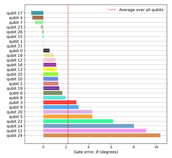 Register variation of the experimentally-obtained Hadamard gate error (in degrees). Each of the 27 register elements was used to verify Equation (36) for . The dotted red line denotes the register mean for the gate error (averaged over all qubits). Qubit 21 is the closest to ideal, while qubit 24 is the farthest. A consistent register color scheme has been used for all the figures.