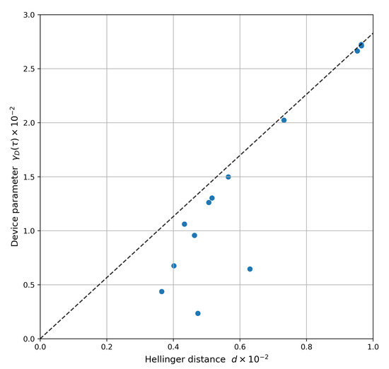 Figure 5 shows the values for and for ibmq_toronto on 8 April 2021, when is set to be the observed Hellinger distance. The blue dots are experimentally-observed data for each register element (see Table A1 for the full list), using the characterization data versus the actual observed Hellinger distance. It validates our noise model as Equation (8) holds. The dashed line in Figure 5 provides the decision boundary to test circuit reproducibility, using characterization data as a proxy. Given a user-defined threshold on the statistical distance between the observed distribution and reference to be reproduced, the plot provides an upper bound for the device parameter (the register variation of is shown in Figure A6). The latter must lie below this boundary for reproducibility by the device. We conjecture that the magnitude of serves as a reliability indicator, i.e., higher value provides greater cushion against temporal fluctuations (see [25]). Thus, Table A1 can serve as a basis for register selection tailored to a specific unitary when channel characterization data is available.