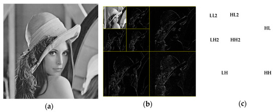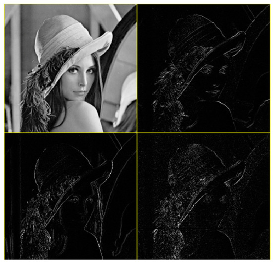 After the image is decomposed by wavelet transform, the absolute value of the low-frequency sub-band coefficients is largest, and most of the energy of the image is concentrated in this part. The low-frequency sub-band can be further decomposed, and the transformed low-frequency sub-band is similar to the cover image. Compared with other transforms, the image still has the characteristics of the spatial domain and frequency domain of the original image after wavelet transform [33]. The low-frequency coefficients correspond to the main features of the image, and the high-frequency part contains the information of the edge and texture of the image, as shown in Figure 1.