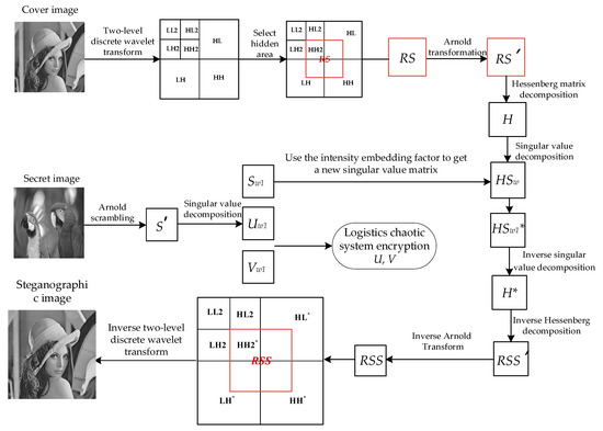 The input of the steganography algorithm is the cover image C, the secret image S, and embedding factor . The output image is the steganographic image C* with secret information. The size of the cover image is M × M, the size of the secret image is M/2 × M/2, and the size of the output image with secret information is M × M. In this paper, Hessenberg matrix decomposition and singular-value decomposition are used to obtain the steganographic image in the embedding process. In addition, this paper selects an appropriate embedding strength factor to ensure that the steganographic algorithm has better performance in terms of invisibility and robustness. The steps of secret image embedding are shown in Figure 4. The specific embedding algorithm is Algorithm 1, as follows: