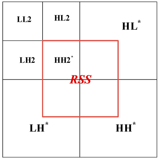 In this paper, the cover image is transformed by two-stage discrete wavelet transform. As shown in Figure 2, the first-order low-frequency region contains most of the image energy corresponding to the main features of the image and the other parts contain the image edge and texture information, and the second-order component LL2 also contains most of the energy of the first-order component. In this paper, the region shown in Figure 3 is selected as the embedded region, which is the middle part of the two-level discrete wavelet transform image, including the sub-band HH2 and some edge and texture information with a small contribution rate. Modifying the coefficient value of the selected hidden region has little impact on the overall image. Embedding the secret image in the selected region ensures the robustness and concealment of the steganography scheme.