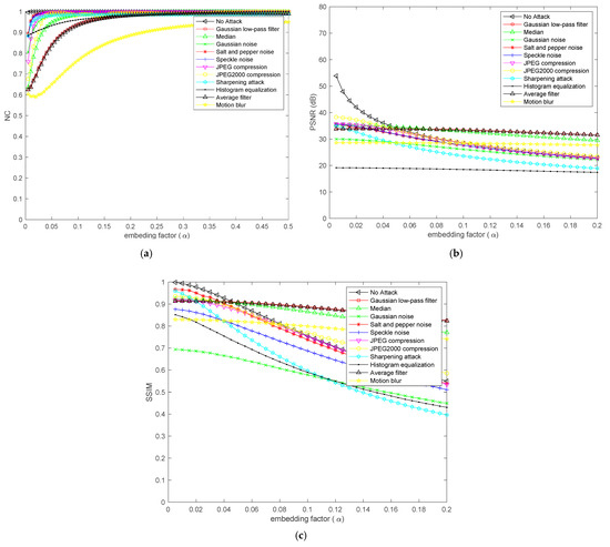 The experiment uses a 512 × 512 Lena image as the cover image as shown in Figure 7a, and this paper uses a 256 × 256 parrot image as the secret image as shown in Figure 7b for steganography. First, we find the most suitable embedding strength factor through PSNR, SSIM, and NC curves under different attacks. The choice of embedding intensity factor is very important to the performance of the algorithm. Figure 8a–c shows the change curves of PSNR value, SSIM value, and NC value under different attacks of steganographic images with the change of embedding strength factor. As can be seen from Figure 8, with the gradual increase of the embedding intensity factor, the higher the normalized correlation of the extracted secret information, the better the integrity of the extracted secret image. However, with the increase of the embedding intensity factor, the PSNR value and SSIM value of the steganographic image under various attacks gradually decrease, and the appropriate embedding intensity factor can ensure the high concealment of the steganographic image and extract the secret image completely at the same time. The performance of the algorithm can achieve a good balance between concealment and the ability to extract secret information from the attacked image. It can be seen from Figure 8 that the concealment of the steganography image reaches an optimal state when the value of the embedding factor is in the range of 0:0.02. Meanwhile, the secret image extracted from various attacks in the range of 0:0.02 can also ensure better integrity. According to the above analysis, the value of embedding intensity factor is selected as 0.01 in the proposed scheme to ensure that the secret information can be completely extracted and the concealment of steganography image can be guaranteed. We use different mother wavelets to experiment the steganography scheme proposed in this paper. We chose Lena image as the cover image and parrots as the secret image. When the mother wavelets are Haar and db, PSNR is 49.5106 db, SSIM is 0.99389, and NC is 0.99955 in the experimental results. When the mother wavelets are sym, bior, and corif, etc., the size of the cover image changes after multi-wavelet transform, which is not suitable for the steganography scheme in this paper. The type of mother wavelet determined in this paper is Haar.