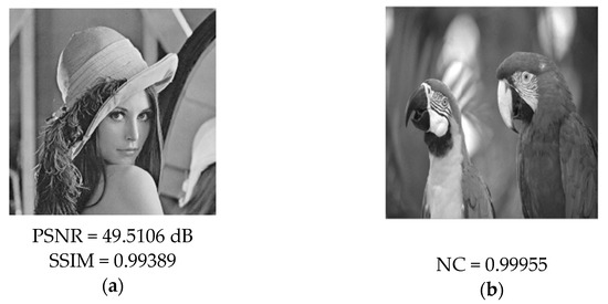 In order to ensure the security of the secret image, the human visual system cannot see the trace of the secret image from the steganography image embedded with the secret information. In this paper, the secret image is embedded into the cover image to obtain the steganographic image, and the secret image is extracted from the steganographic image without any attack. The simulation results are shown in Figure 9 and Figure 9a is the steganography image embedded with the secret image information. Figure 9b is the extracted secret image and shows the peak signal-to-noise ratio and structural similarity between the steganographic image and the original cover image. When the peak signal-to-noise ratio is greater than 37 dB, the secret information embedded in the cover image is invisible to the human visual system, and when the structural similarity is greater than 0.93, it indicates that the steganographic image is not much different from cover image.
