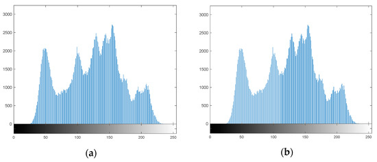 (a) Cover image histogram (b) Steganographic image histogram.