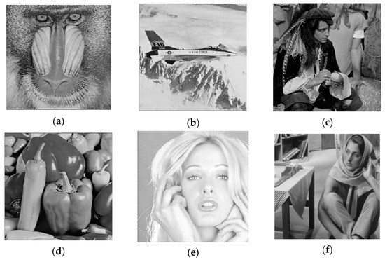Steganographic images. (a) Steganographic image Baboon; (b) Steganographic image Airplane; (c) Steganographic image Man; (d) Steganographic image Peppers; (e) Steganographic image Tiffany; (f) Steganographic image Barbara.